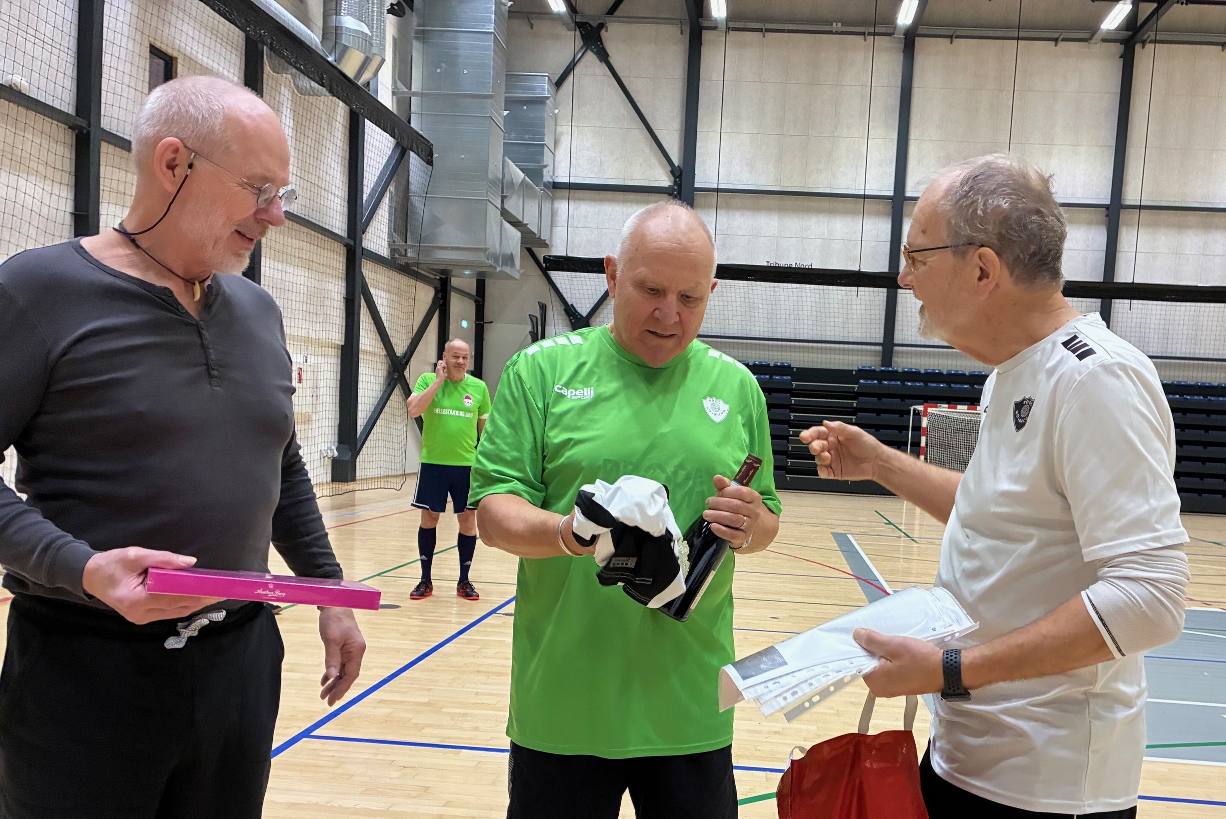 Træner Gert Drexel (th) overrækker Børge Samuelsen en æske chokolade og ønsker ham velkommen tilbage i FC Prostata og Venner i Køge Boldklub efter sit uheld sidste onsdag.