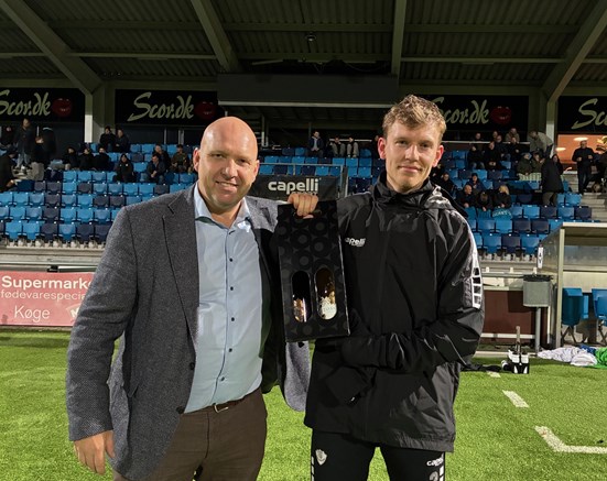 Kasper Kling modtager en gave fra Køge Boldklubs formand Brian Schille (tv) inden opgøret mod Solrød FC for at have rundet 100 officielle førsteholdskampe for klubben.