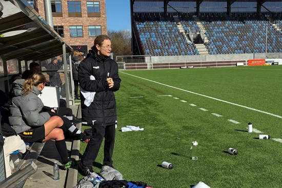 Cheftræner Sebrina Elken følger kampen fra sidelinjen.
