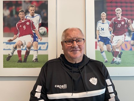 Erik Kaner Madsen foran fotos af to spillere, som han har trænet i Køge Boldklubs ungdomsafdeling, og som nåede at spille sammen på Danmarks A-landshold - Jon Dahl Tomasson og Søren Larsen (th).