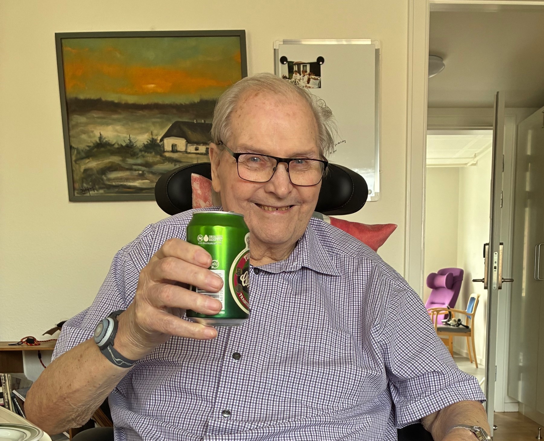 Ole Ingemann som man kendte ham - et stort smil og en øl i hånden klar til en skål med vennerne. Her er han foreviget i hans lejlighed på Plejehjemmet Møllebo i Køge i forbindelse med hans 88 års fødselsdag i juli måned.